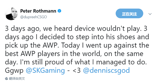 赛后dupreeh在推特上这样说道:三天前,我收到了device不能参赛的消息;三天前,我决定拿起AWP做device的事。今天,我和世界上最出色的狙击手对抗,对于我所做到的,我感到非常骄傲。祝贺SK Gaming,感谢dennis。