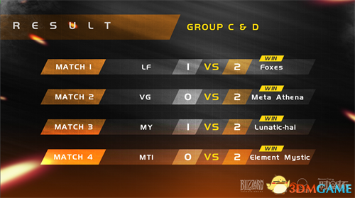 CD组的中韩决斗在12月3日正式打响。值得令人兴奋的是,LF以强势的状态应对Meta Athena,以2:0顺利拿下比赛;另一边,冲劲十足的MT1也没有屈服于曾经的大魔王Lunatic-Hai,在尼泊尔利用自己擅长的双飞阵容从对方手中拿下一分。然而,昨晚刚刚结束的比赛中,即使LF的阵容技术相较以前有明显的进步,但最终还是憾负Foxes,未能直接晋级胜者组。国内人气实力战队MY在前面的赛事中,表现不负众望,一度手握优势,但高手间的对决,胜负往往就在一瞬间,Lunatic-Hai在最后关头,抓住关键机会让一追二战胜了MY。至此,D组的胜负组情况已明了,而C组胜负组争夺进入白热化,LF成为唯一一个有望进入胜者组的中国战队。