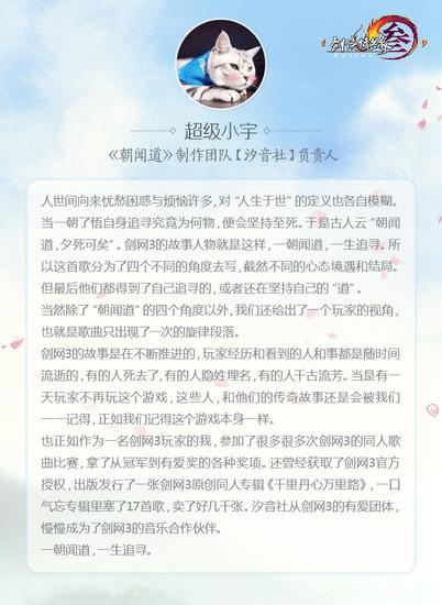 为感谢全体大唐侠士对于《剑网3》游戏音乐的支持,今后《剑网3》更将以十二分的努力和付出创作出更多的动听旋律!同时也将发布更多《剑网3》文化衍生,以回馈侠士厚爱,敬请期待!