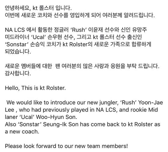 12月6日,英雄联盟LCK联赛KT战队宣布签入打野Rush、新人中单Ucal与教练Sonstar。
