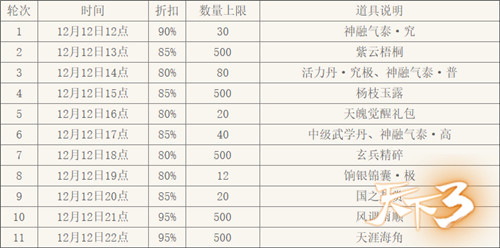 好礼有限,先到先得,双十二庆典之际《天下3》放出多款珍稀道具限时秒杀,少侠快来过手瘾。今天《天下3》双十二秒杀狂欢限时开启,所有珍稀道具折扣力度前所未有,不同时段不同物品优惠,你想要的全都有。机不可失,失不再来,少侠赶紧加入到双十二秒杀狂欢中来吧,抢到就是赚到!