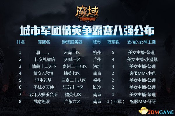 《魔域》全新竞技场近期正打得如火如荼,同时《魔域》城市军团精英争霸赛也正进行的火热,经过紧张残酷的联赛模式角逐,目前正式决出以【溺﹏﹏。】、【仁义礼智信】、【丨情義丨灬天下】领衔的八强队伍,他们即将争夺价值高达数万元的总奖金,如果押宝竞技女神成功,奖金还有机会翻倍,可以说实力和眼光都决定着最后奖励的归属,而冠军成员还能和《魔域》目前最为火热的女神主播面对面互动,福利相当可观。