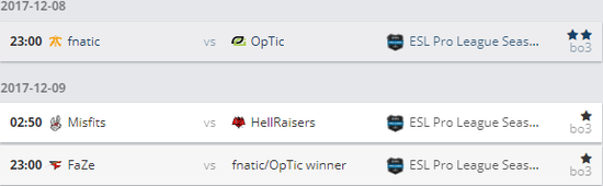 在12月8日晚23:00剩余的四支队伍将会进行BO3淘汰赛,其中Fnatic和OpTic的胜者将会对上FaZe,而另一边Misfits和HellRaisers的胜者将会在12月10日对阵SK,让我们拭目以待。