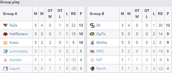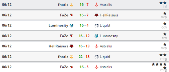 ESL Pro S6总决赛小组赛第二天的战斗已经结束,Liquid、Astralis、LG、NIP、North、NRG惨遭淘汰。FaZe和SK则直接晋级到了半决赛中,HellRaisers、Fnatic、OpTic、Misfits则要进行BO3的单淘赛。