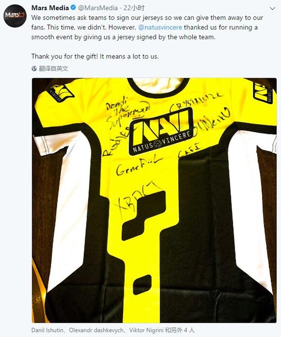 赛后OG的Fly、Na’Vi老将Dendi还专门发推特称赞MDL的专业,Na’Vi全队还特地赠送了一件全队签名的队服作为感谢送给了主办方Mars:
