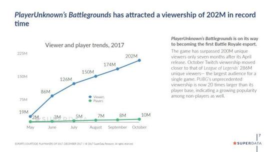 报告同时透露,《绝地求生》在短短7个月就收获了2亿观众,可见电子竞技市场的增加仍然大有空间。