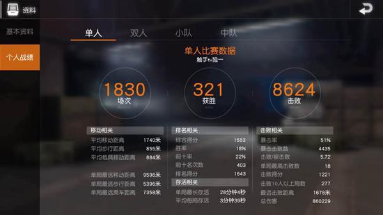 独一总共参与了1830场游戏,按照每局平均五分钟来计算,那就是玩了152个小时,就算一天玩4个小时,那也是玩了38天,也就是说这个游戏刚发布,独一就在玩,而且一直玩到了现在。1830场游戏中,独一共获得了8624个击杀,平均每局超过四个击杀。其他数据也都远超平均值,如此高的游玩时间和击杀数量,是所有榜单上的玩家远远不能比拟的,而独一也因此成为了手游吃鸡当之无愧的一哥,被十万在线粉丝们称为“手游韦神””、“手游吃鸡一哥”。