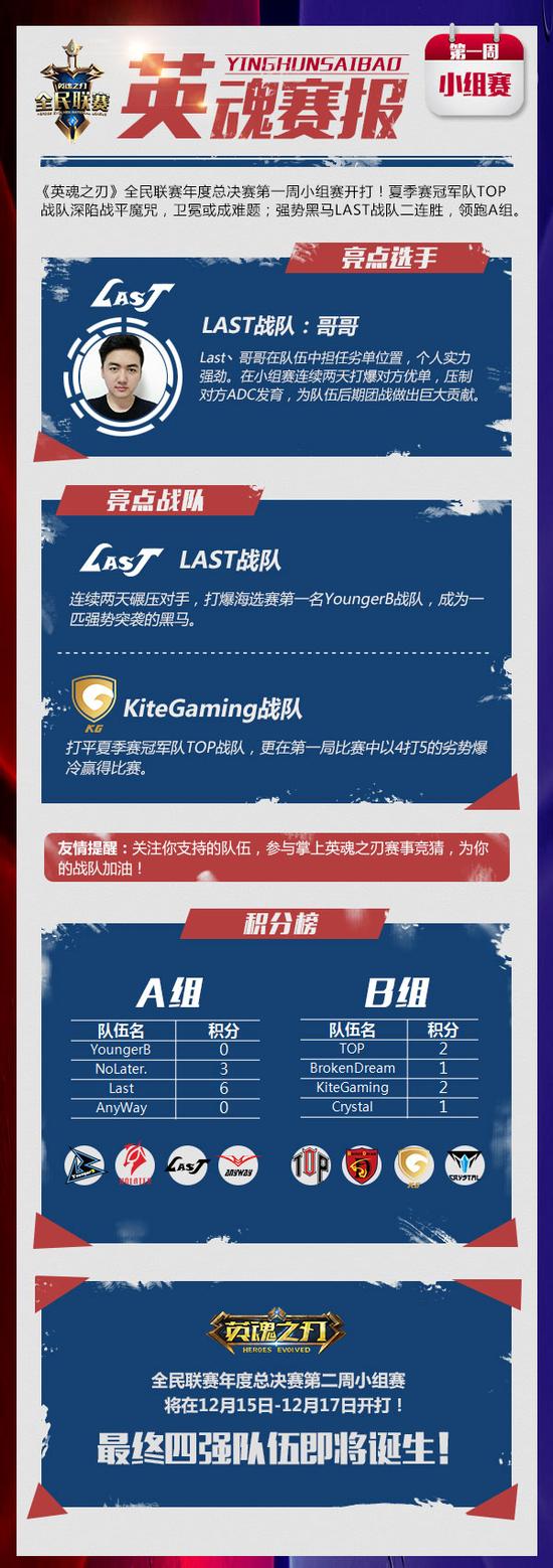 狭路相逢勇者胜!《英魂之刃》全民联赛年度总决赛小组赛第一周精彩连连!黑马“Last”战队强势杀出,接连斩翻“Anyway”、“YoungerB”两大战队,领跑A组;而夏季赛冠军战队“TOP”深陷战平魔咒,在面临新生队伍“KiteGaming”时,第一局对战中以5打4的优势却爆冷输掉了比赛。“TOP”战队是否还能延续夏季赛的辉煌?