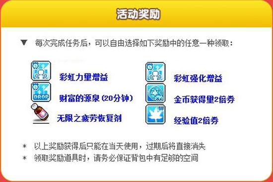 新的一年,新的挑战,完成<【活动】挑战!冒险岛彩虹>中的多种任务,就能获得“彩虹力量增益”、“经验值2倍券”、“无限之疲劳恢复剂”等奖励;根据完成任务的次数,还有机会领取“冒险岛导航仪”和“挑战!冒险岛彩虹!”称号~