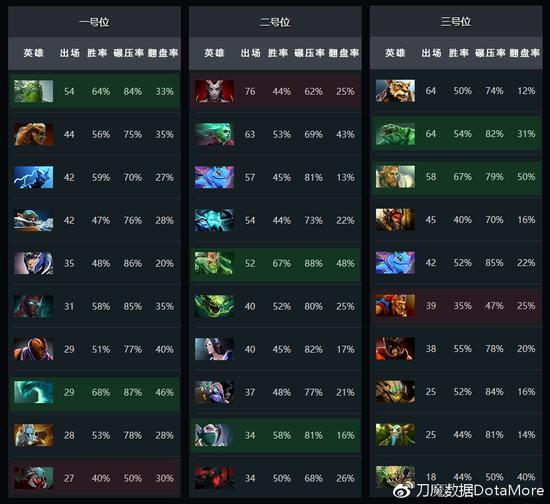 在三号位上,自从全能的套子不能被散失后,全能骑士上场率陡增,在职业赛场的表现终于符合水友们的认识,胜率最高的三号位,翻盘率高达50%,而且碾压率也有79%,这样的英雄谁不爱。潮汐和酒仙都是出场次最多的英雄,从实际效果来看,潮汐明显是更优的选择,在胜率、碾压率和翻盘率上都更高。蝙蝠是明显被目前版本遗弃的英雄,胜率和碾压率都是最低的。