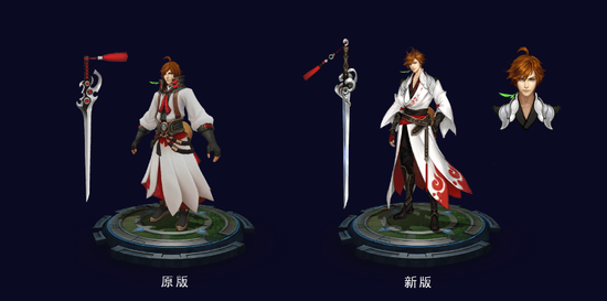 从新旧李白的模型比较中,可以看出原版中李白模型的呆萌少了不少,原本的蘑菇头加可爱的身型确实与“剑仙”的称呼有一点差距。