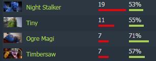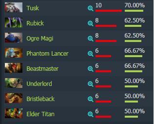 在禁用英雄榜单中,Fnatic最常规的Ban人名额同样是版本宠儿夜魔,禁用次数达到了19次。紧随其后的小小和蓝胖也是常规选项,分别为11次和7次,同样达到7次的伐木机算是克制队伍风格的英雄,他是Fnatic很多偏好英雄如孽主,钢背兽的天敌。