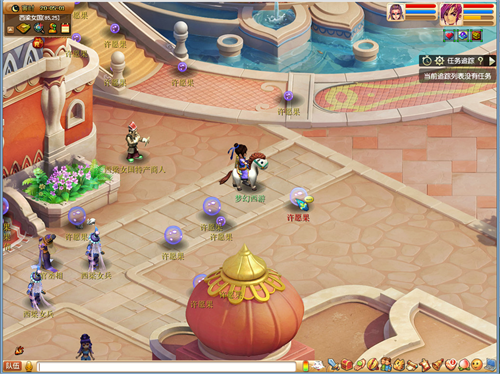 不仅如此,活动期间每天0:00到23:59分的每个整点,在江南野外,建邺城,东海湾,宝象国,西梁女国将随机降下许愿树,许愿树将在一定的时间内开花结果,玩家(等级≥30级,单人)可以前往采撷,获得丰厚的金钱,经验,随机元旦积分奖励。