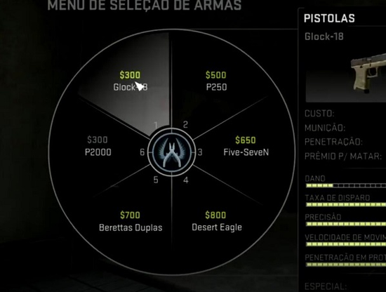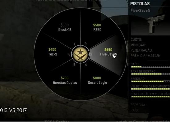 上图是2013年版本T的手枪界面,下图是2013年版本CT的手枪界面。可以看出当时的CT是可以买Glock的,由于Glock近距离子弹多,一枪爆头的优势,在卡近点时作用过于强势,刷屏能力极强,所以V社将Glock移除了CT的购买界面。同时,也全面下调了手枪的价格,较为低廉的价格可以让进攻方在手枪局省下钱买烟闪,这样的改动无疑促进了手枪局战术的多样性。