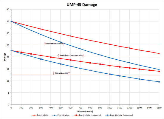 由于UMP45以1200的低廉价格、稳定的弹道、可观的伤害和600的击杀奖励在游戏中过于强力,导致比赛中出现了不是AKM4就是车王的现象,其余枪支根本没有露脸的机会。因此V社削弱了车王,增加了它伤害距离衰减,从此“小M4”的称号一去不复返,UMP45基本丧失了远点对枪的能力。