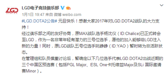 经过俱乐部之间的友好协商,原MAX战队选手杨沈仪(ID:Chalice)已正式转会至LGD,作为一名非常年轻有潜力的三号位选手,愿他的加入能够给LGD注入新的力量!同时,原LGD战队五号位选手姚峥峥(ID:YAO)暂时转为非活跃状态。