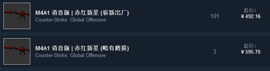 M4A1|赤红新星的热度虽不及暴怒野兽,却一直都是高富帅的代名词。红色金属光泽高端大气上档次,低调奢华有内涵。又是大行动掉落皮肤,很是稀有。所以价格自然比较贵,崭新要492元,略磨要595元。你们都知道接下来的话了:然而并没有什么O用,只推荐低磨损崭新,因为略磨的磨损根本没法看。