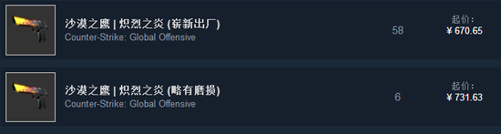 CS:GO中最受追捧的手枪(尽管用它的人一般都死的挺惨),CS:GO中最受追捧的皮肤,所以火沙鹰的价格也是为所欲为。崭新价格670元,略磨价格731元。是不是很惊喜?它已经是炙热沙城系列收藏品的顶级品质皮肤,所以它价格就是它自身的价值体现,真喜欢火沙鹰的玩家只推荐崭新。