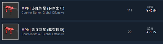 MP9|赤红新星是赤红新星系列中最便宜的,得益于它自己不热门,合成出的MAG-7也不是热门皮肤。所以价格大多数玩家还是可以接受的。有玩家看到价格可能会问:为什么崭新才40块,略磨却要70块呢?那是因为赤红新星磨损区间是0—0.08,崭新区间是0—0.07,而赤红新星的略磨区间只有0.07—0.08。所以略磨的数量远远小于崭新,物以稀为贵。然而并没有什么O用,GO哥是外貌协会的,只选崭新,推荐在0.01以下磨损寻找。