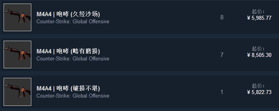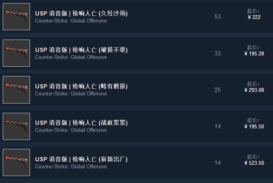 枪响人亡是最受欢迎的USP皮肤,而USP又是热门手枪。所以价格,你懂得。最便宜也要195元!而崭新的枪响人亡竟然高达523元。有钱的感觉真好……如果喜欢这款皮肤,推荐从低磨损久经和略磨中挑选,价格在两三百元之间。至于崭新当然好,适合有钱可以为所欲为的玩家。