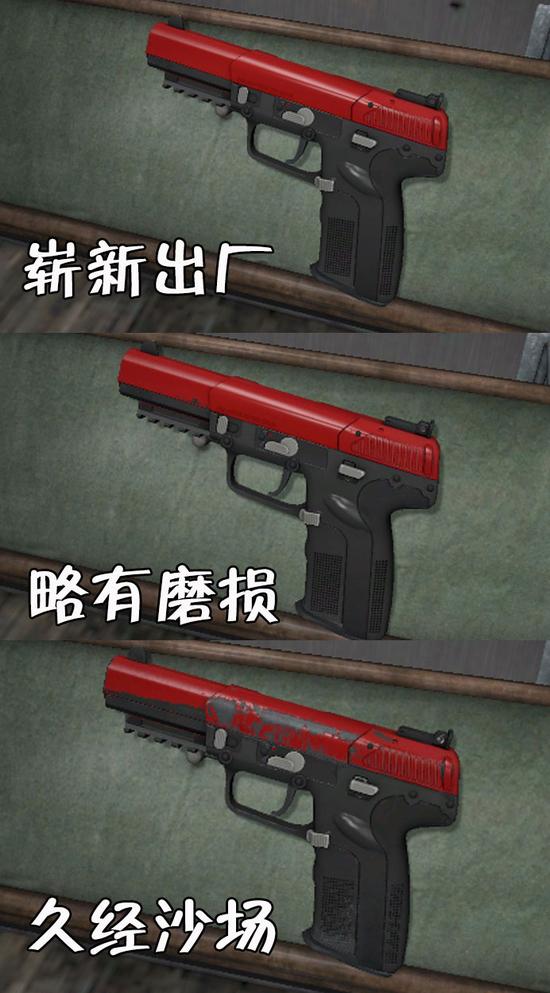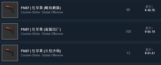 尽管与格洛克|红苹果相同的色调,相同的名字,相同的载弹量,但价格却相差了近30倍!那是因为FN57|红苹果是合成格洛克|渐变之色的次级素材,也就是说100把FN57|红苹果有50%的概率可以合成1把渐变格洛克。所以这个价格就不奇怪了,因为低磨损红苹果外观才好。所以推荐极限磨损略磨和崭新,其实价格相差不算大。