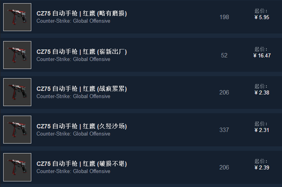 上期有玩家说红网CZ太贵了,那么红鹰就非常良心了。除了崭新,其他磨损均在6块钱以内,花个2块钱买把久经岂不美滋滋?红鹰不吃磨损吃亮度,久经、略磨、崭新随便选。