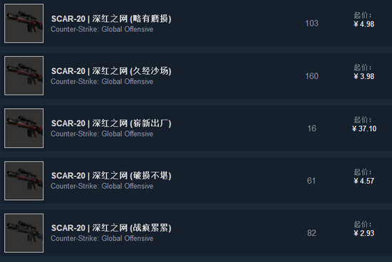 SCAR-20毕竟是款冷门枪,萌新们很喜欢,但在AK以上分段除了某些防RUSH点位外,这把枪没什么用处。所以价格比较便宜,略磨也不到5块钱。但GO哥也说了,深红之网太太太吃磨损,只要预算够只推荐崭新,价格37块也不贵。当然如果你够细心,挑选极限略磨也是可以接受的。另外红网自带玄学属性,什么中心大网、双网、三网等等,不过SCAR-20这款枪几乎没什么人跟你谈玄学,喜欢就好。