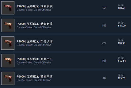 因为P2000不热门,所以至尊威龙的价格还是比较便宜的。紫色战痕还不到9块钱,略磨不过12元,即使是崭新也才23元。由于不太吃磨损,选一款你喜欢的外观即可。