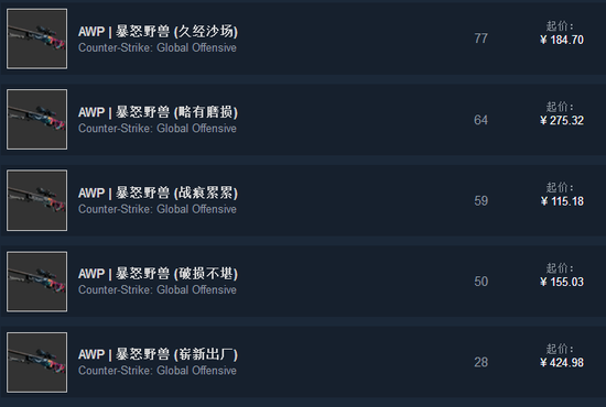 暴怒野兽是AWP备受追捧的皮肤,所以尽管问世已久但价格依然不低。价格最低的战痕皮肤也要115元,而且这个价格你是挑不到上面介绍的红龙狙的,而崭新皮肤高达424元。因此推荐大家选择低磨损略磨,价格在275元左右。崭新控就不要想省钱了,喜欢红龙狙的玩家你们就要仔细挑选看眼缘咯。