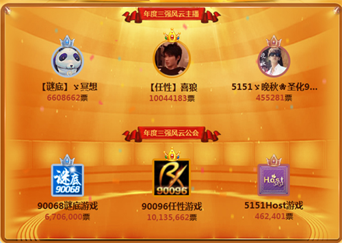 在2015年的CC年度盛典中,进入6大天团的PK阶段之后,势力纷争变得错综复杂起来。90068和90096作为两大顶级公会,摩擦摩擦,更互视为最强的竞争对手!彼此的天团虽然没有直接对垒,却同样在暗地里不断地较劲!在“大哥下手轻点”(包括蛋炒饭等多位官方频道主播)和“6吨天团就是造”(包括90096、5151、518频道的喜狼、烟花等5位主播)的PK中,可见一斑!