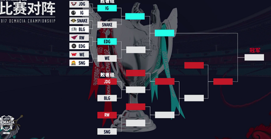 接下来的比赛胜者组将由IG对阵Snake,EDG对阵WE;败者组JDG对阵BLG,RW对阵SNG,败者组两场比赛的败者将率先被淘汰。