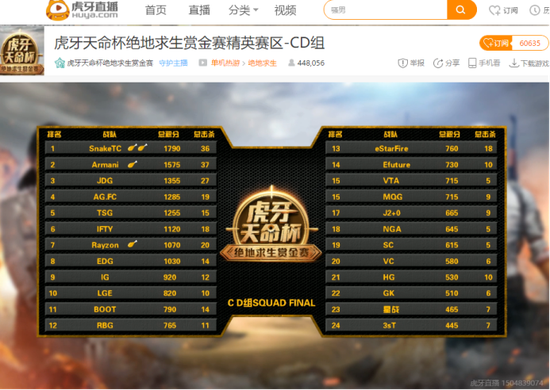 最终,凭借着二连吃鸡的成绩,SnakeTC以超过第二名200分的成绩位列C、D组的积分榜榜首,而突破击杀人头上限吃鸡的Armani战队则位居第二名的位置,战术大师A+的队伍虽然没有成功吃鸡,但也凭借着战术的优势位居前六,暂时保持在了第一梯队的位置。今天的比赛正如比赛的名称一般,赛况由天命决定,那么在接下来的比赛中,哪一只队伍会成为天选之子呢?1月7日晚7点30,虎牙直播天命杯战火继续~