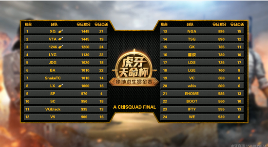 以上,就是虎牙天命杯绝地求生赏金精英赛区第三日AC组的对决情况。1246凭借着吃鸡及多场击杀和好名次,领先第二名的XQ战队500分,位居A组第一。下周周五至周日,虎牙天命杯仍将继续开赛,下周的比赛即将决出最后晋级决赛的队伍,千万不要错过哦~