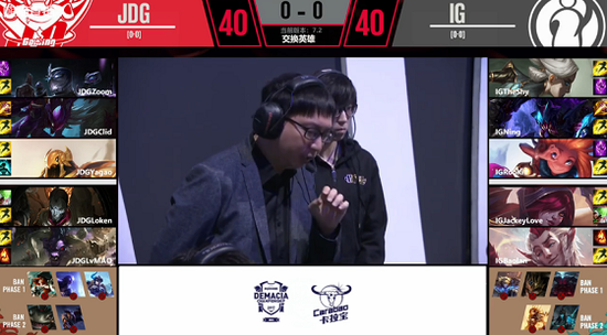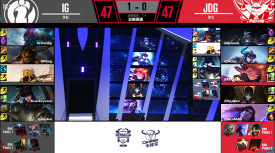 JDG很有针对性地ban掉了JackeyLove的德莱文,IG选择了洛与霞的下路。