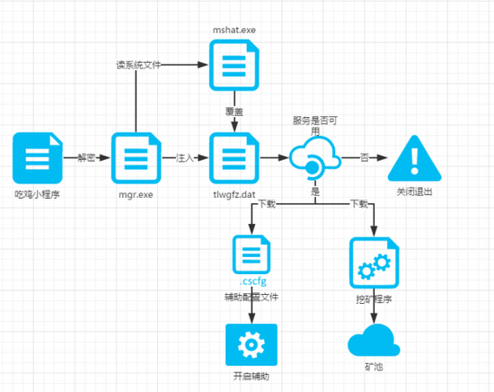 腾讯安全中心也放出了挖矿程序的运行流程,我们看到当外挂开启后,挖矿程序就会神不知鬼不觉的在后台运行,开挂的玩家愉快的大杀四方的同时,外挂的开发者也许正坐在家中数钱数到手软。