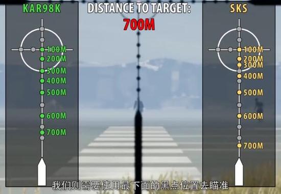 700m时我们使用98k需要用最后两个瞄准点中间的位置去瞄准,而SKS的则超出了最后一个点,在最后一个点稍微再往下一点的位置。