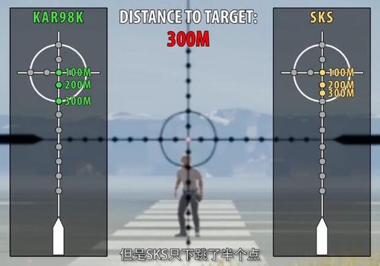 同四倍镜一样,在300m的时候98k和SKS之间的子弹下坠程度出现了偏差。300m时,98k还是严格与瞄准镜上的瞄准点同步,下跳到了第三个瞄准点;而SKS不同的是它的精确瞄准点只在八倍镜的瞄准点上下跳了半格。