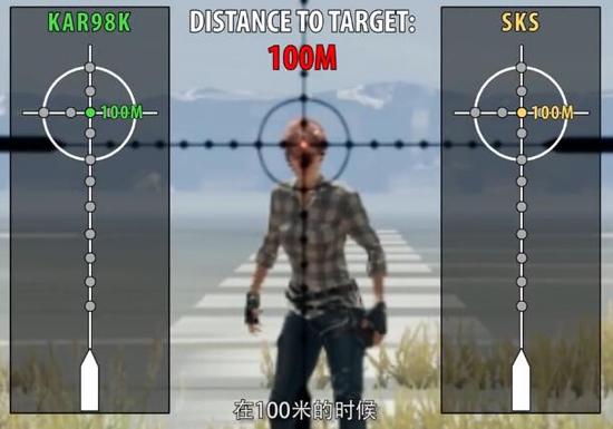 100m同样是98k和SKS在八倍镜下的默认归零点,也就是说在100m之内,只需要将准星的正中央瞄准目标就可以达到指哪打哪的效果。