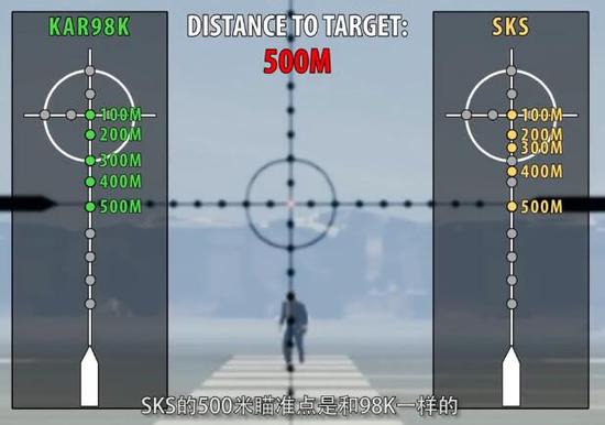 但是在600m的时候,98k会子弹下坠程度会更厉害,此时下跳两个瞄准点,SKS也是保持一致的。