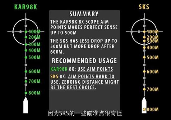 所以,我们可以得出,同四倍镜一样,八倍镜似乎在这个版本上是为了98k而量身定做的,500m内每一个瞄准点都代表了一个距离,十分的好用;而SKS在超过600m之后子弹下坠变得太大,在八倍镜的准星上很难判断位置,故不推荐。不过推荐大家可以试试使用调整归零的手法使用八倍镜SKS,效果要比在倍镜中手动瞄准好得多。