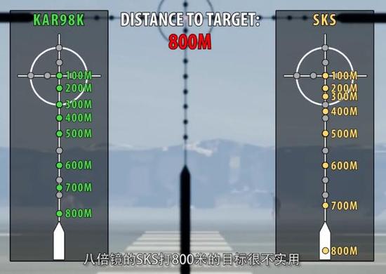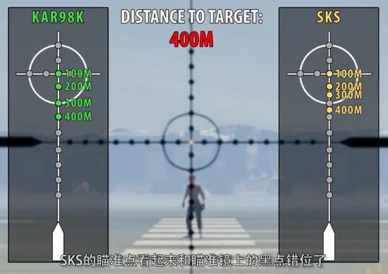 400m时98k继续保持着下跳至下一个瞄准点的规律,此时SKS也是一样从300m的位置下跳了一个瞄准点的距离,处于八倍镜的第三和第四个瞄准点中间的位置。