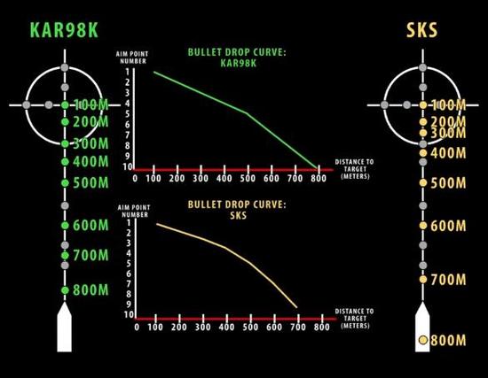 同样的,我们以新版本的98k和SKS为列,在新的八倍镜瞄准线下一起来看看他们的子弹下坠程度。