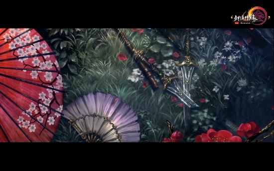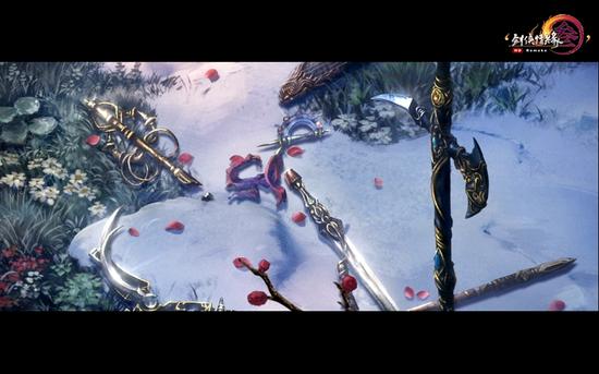 动画PV开场以经典手绘风格创作,无论是远处的水墨山林,还是近处的繁花脉络都极具国风神韵。而红花在风中飞舞飘落和雪地中武器脚印的细致交互描绘都足见制作组对这部正剧动画的品质要求。