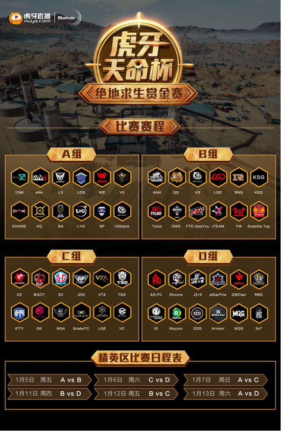 虎牙天命杯绝地求生赏金赛自2017年12月31日打响,在经历了两天的对决后,12只战队从挑战者区脱颖而出,参与到了天命杯的正赛环节。在这12只战队中,不乏职业战队的身影,而经过有序地分组后,他们与国内受邀的36只知名战队一起分为A、B、C、D四个小组。在1月5日,由韦神领衔的4AM就将与A+领衔的IFTY再次碰撞,作为2018年两队的首次碰撞,鹿死谁手值得期待。