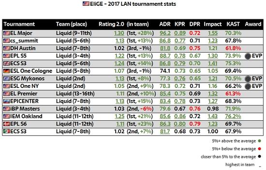 EliGE是2017整一年里,发挥最稳定的选手之一,他在大型比赛中也是这样,与之对应的,EliGE有着在锦标赛中1.15的平均rating。