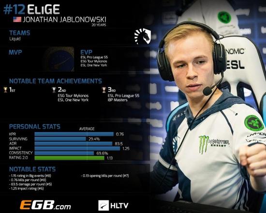 EliGE在2017所积累的成绩本应该让他排名更高的,但是在大型比赛的淘汰赛阶段中,他只打出平均1.03的rating(同时由于队伍原因,他也只打了13张地图),远低于在小组赛中1.18的平均rating。这也让他不能在2017的评选中排名更高,只能遗憾止步第12名。