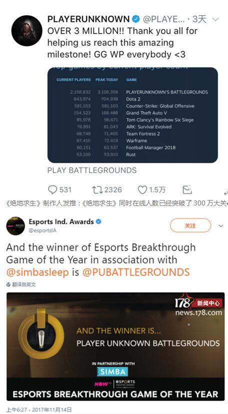 《绝地求生》摘得2017年度英国EIA(电竞产业奖)年度最佳电竞游戏奖项