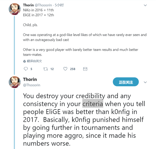 在推特上,Thorin不无愤怒的表示:NiKo in 2016 = 11th EliGE in 2017 = 12th。一个是有着统治级表现的顶尖选手,另外一个只是一名不错的选手,有着较好的战队成绩和更好的队友。