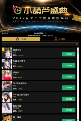 2018年1月9日13:26 截图此次大赛是依据小葫芦大数据严格甄选,共有两百多位主播进入线上pk榜接受网友投票评选,最终决出男神/女神各十强。获胜主播除了获得荣誉外,也将受邀参加直播行业年度盛典——小葫芦2017全平台主播全景颁奖礼。