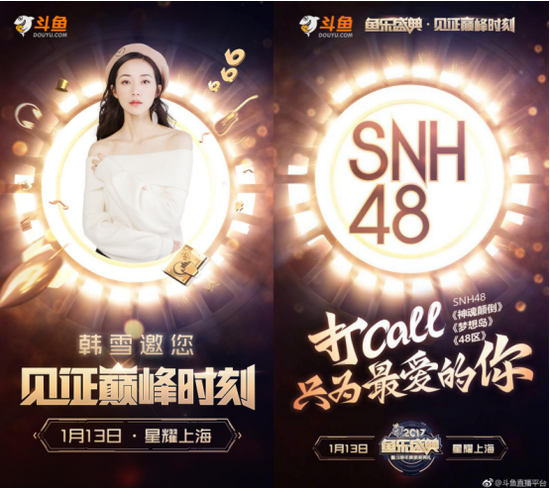 不仅如此,这次的颁奖典礼还邀请到了大家熟知的影视歌多栖艺人韩雪和女子组合SNH48的参与,韩雪在斗鱼的跨界科技直播可以说奠定了她“科技女神”的地位,全能的韩雪姐姐此次的出现让人充满期待。而作为当红女子偶像组合,SNH48的小姐姐们也都拥有非常高的人气,在斗鱼官博刚发出献唱歌单后,粉丝们就展开疯狂猜测到底是哪一队会登上舞台?